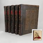[Paston letters] (Fenn, John, ed.:) (Frere, Serjeant:) Original Letters, written during the Reigns of Henry VI, Edward IV, and Richard III, by various Persons of Rank or Consequence [...] with Notes, Historical and Explanatory; and Authenticated by Engravings of Autographs, Fac Similes, Paper-Marks and Seals. London: printed for G.G.J. and J. Robinson, 1787, 1789, 1823. 5 vols., extra-illustrated. Vols. I-II second editions with additions and corrections, vols. III-V first editions. 4to., pp. lxxxvii, [i], 301, [i]; [iv], 363, [i]; [iv], xvi, xxxvi, 451, [i]; [vi], xxxii, 478, [ii]; lxxvi, 472 + additional engraved vignette title and coloured engraved frontispiece to each vol. + 34 facsimile plates + 34 further plates. Extra illustrated with additional coloured engraved plates (landscapes etc), including folding map of England and Wales. With half-titles. Parallel medieval and modern texts. Vol. I preliminary blanks, title and pages facing tissue guards toned; small closed tear to map, occasional foxing, a few ink spots. Vol. II occasional foxing and toning, some neat pencil notes. Vol. IV, Some leaves a little toned, also some toning and light damp staining to plates. Some vols. bearing evidence of a bookplate having been removed. Contemporary calf panelled boards rebacked in mottled calf, spines gilt, raised bands, red and black spine labels, all edges faintly blue, marbled endpapers. A few chips to spine, board leather dry and rubbed, corners very worn, but good sound copies. To front paste-down each volume, crimson leather and gilt book label of W.A. Foyle of Beeleigh Abbey and ms inscription at head of ffep verso, Liverpool, Kirkham Abbey [illegible] 1907. Vol. I with pencilled note to front endpaper, 'Duke of York's copy'. John Fenn's edition of the Paston Letters was the first printing of this invaluable collection shedding light on the life of an aristocratic family (the Pastons, later Earls of Yarmouth) in the fifteenth century. The editor obtained the documents from the executors of a chemist in Diss, Norfolk, and later presented the originals for volumes I and II to George III, receiving a knighthood soon after. The work was nevertheless suspected for years to be a forgery, until the material (including what he had given to the King) resurfaced in various country houses in the later part of the nineteenth century. The fifth volume was sent to the press posthumously by Serjeant Frere, Fenn's nephew (Ency. Brit., 11th edn.) Lowndes 788: "Two editions of Vols. 1 & 2 were printed in 1787, but there is no perceptible difference between them." ESTC N010147 & T149304. Ref: 54569show full image..