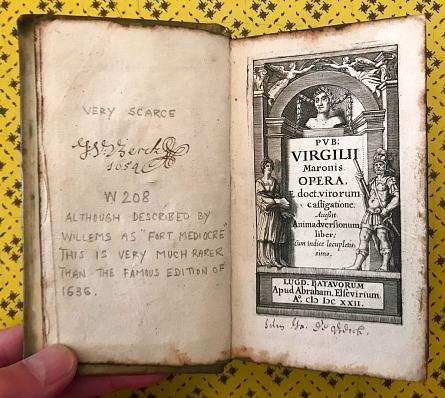 Description: 12mo. pp. [xxiv], 394, [xxv]. Engraved title. Light marginal staining from edge-colouring, few leaves dust-soiled, small clean tear at gutter of p.117. Contemporary vellum, title inked to spine, strips of 15th century manuscripts used as spine lining, all edges blue. Covers rubbed. Bookplate of Robert J. Hayhurst to front pastedown, contemporary autograph 'Jacobus de Berck' dated 1654 on front pastedown and flyleaves, his student's annotations in Dutch in a few places.