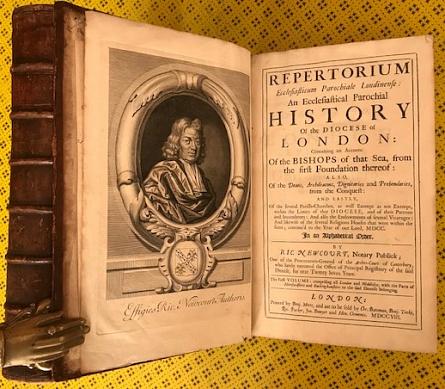 Historian and notary Richard Newport (d.1716) complied this history of the Diocese of London from sources including the London Registers (begun in 1306), registers kept by individual bishops and a return of 1636 from which he took information about the income of the parishes. His father (also Richard Newcourt, d. 1679) was a cartographer and draughtsman who, in addition to contributing drawings to Dugdale's Monasticon, was also responsible for the most important map made of London before the Great Fire, his Exact Delineation of the Cities of London and Westminster and the Suburbs Thereof (1658). John Hoadly (1711-1776) was a poet and dramatist, and a friend and correspondent of David Garrick. The appearance of 'LLD' on his bookplate dates it from sometime after 1747. Henry Carrington Bowles (1763-1830) was a successful publisher and seller of maps, prints and geographical games. His bookplate dates from sometime after his marriage in 1799. The ephemera found between the pages of vol. I appears to relate to his ownership of the book. Loosely inserted: two letterpress-printed sheets reproducing letters sent in January 1824 and February 1827 to The Gentleman's Magazine, concerning London churches destroyed in the Great Fire of 1666 (both from 'H.C.B.'); small hand-drawn and coloured arms of Sir John Philpot, Lord Mayor of London 1378, on a scrap of paper; a piece of tracing paper with a coat of arms and an inscription referring to Sarah Bolles; 4 scraps of paper with MS notes, one seemingly part of a letter addressed to H.C. Bowles Esq. and dated 1827; a long MS list of churches on a folded piece of paper watermarked 1821.