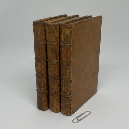 Description: 3 vols. 12mo., pp. [iv], xxxvii, [iii], 158, [iii] + portrait frontispiece; [iv], 224 + folding map; [iv], 245, [iii]. Half-title to each volume, vol. I with single-page Foulis catalogue at rear, vol. III with two-page catalogue. Variant using paper of slightly lower quality, very occasional faint spotting but generally bright. Contemporary plain tan calf, raised bands gilt ruled, spine labels mostly lost with blind impressions remaining, edges sprinkled red. Spines dry and rubbed, vol. III upper joint split but board firm, endpapers toned at edges, very good indeed.