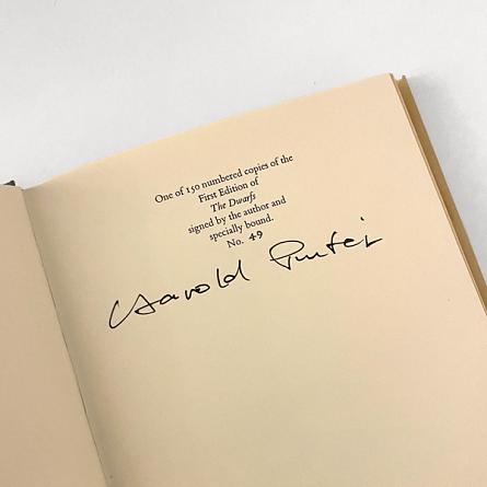 'One of 150 numbered copies of the First Edition of The Dwarfs signed by the author and specially bound. No.49.' Signed beneath by Pinter.