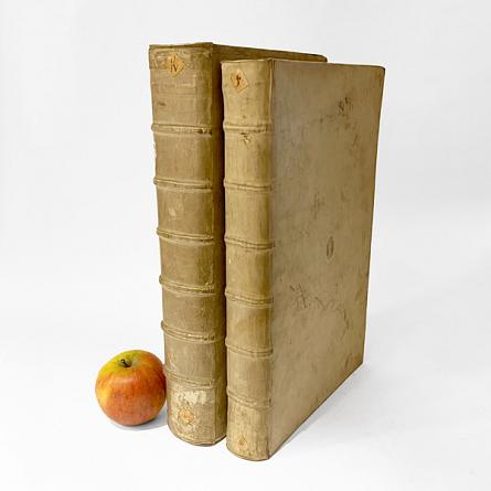 Description: First edition thus. 2 works in 2 vols.. Folio, pp.[xx], 800, 84; [xvi], 497, [xxxv]. First vol.: with engraved emblem plate of a porcupine accompanying a motto on envy; engraved vignette to tile-page, woodcut initials and head- and tail-pieces; a little light sporadic toning, 5L2 and 5L3 a little toned with tiny hole affecting a couple of letters. Second vol.: title-page in red and black with printer's device; woodcut initials and head-pieces; half-title a little foxed and dusty; 2T slightly blotchy; 3V has been misbrand in the middle of 3X. Uniformly bound in blind tooled vellum, raised bands, embossed centrepieces, edges sprinkled red. Ties lost, some smudgy or dusty grey marks, very good indeed. Library bookplate with coat of arms to front paste down and small paper labels with shelf marks to head and tail of spines. Embossed coat of arms to head of both title-pages.